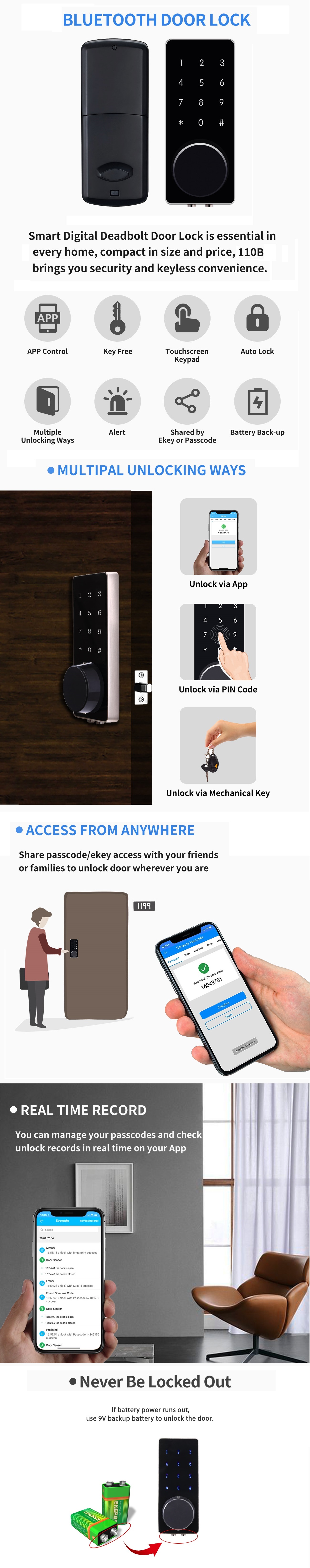 Dieses Bluetooth-Riegel-Türschloss bietet Ihnen ein erstaunliches schlüsselloses Zugangserlebnis. Anstatt Minuten damit zu verbringen, Ihren Schlüssel aus Ihrer Tasche zu suchen, auf das Schlüsselloch zu zielen und den Zylinder umzudrehen, müssen Sie nur Ihre Telefon-App leicht berühren. Dann wird das Schloss automatisch für Sie entsperrt.